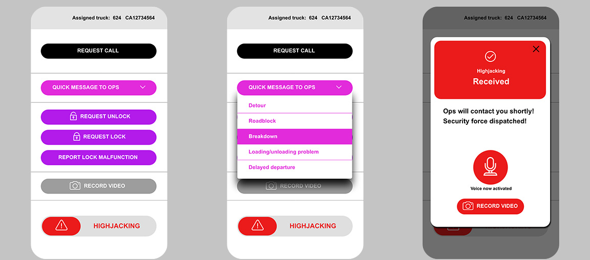 A driver app would need to be developed to communicate unlocking requests and alert agents to highjackings. An addition was a short predefined list of quick messages. Importantly it was decided that the app contain the barest minimum of functionalities for simplicity.