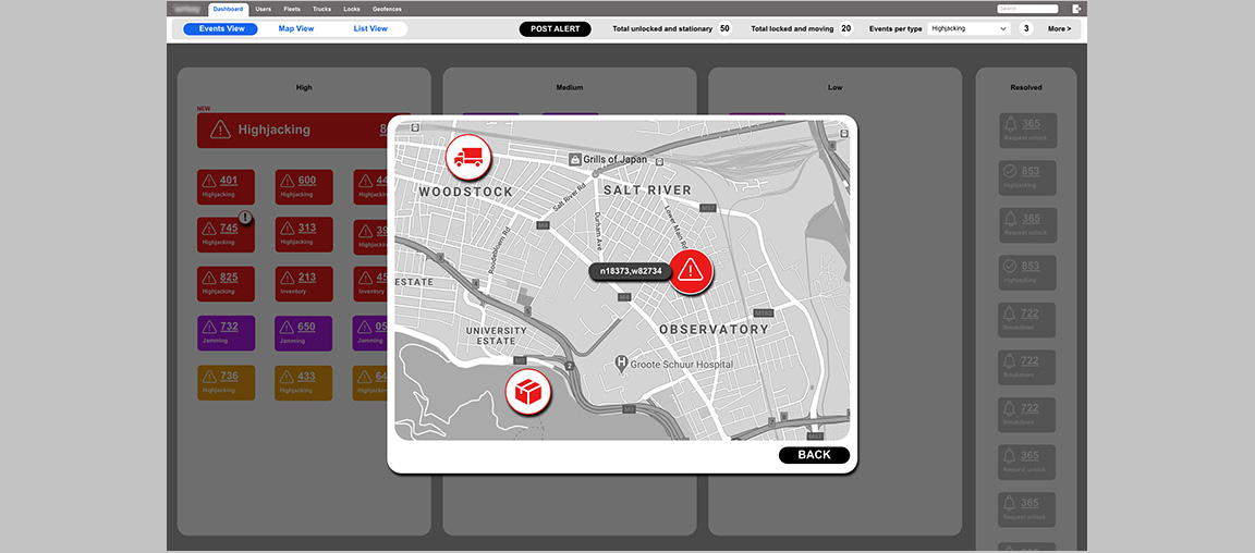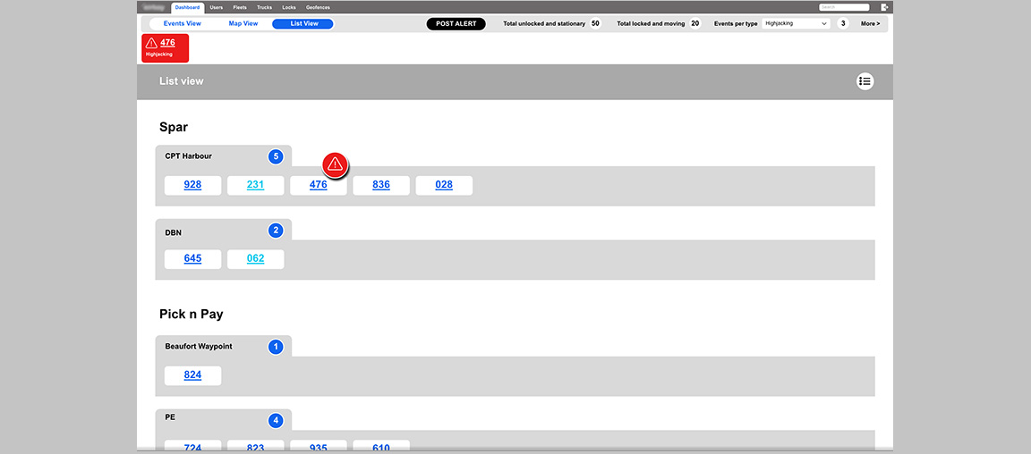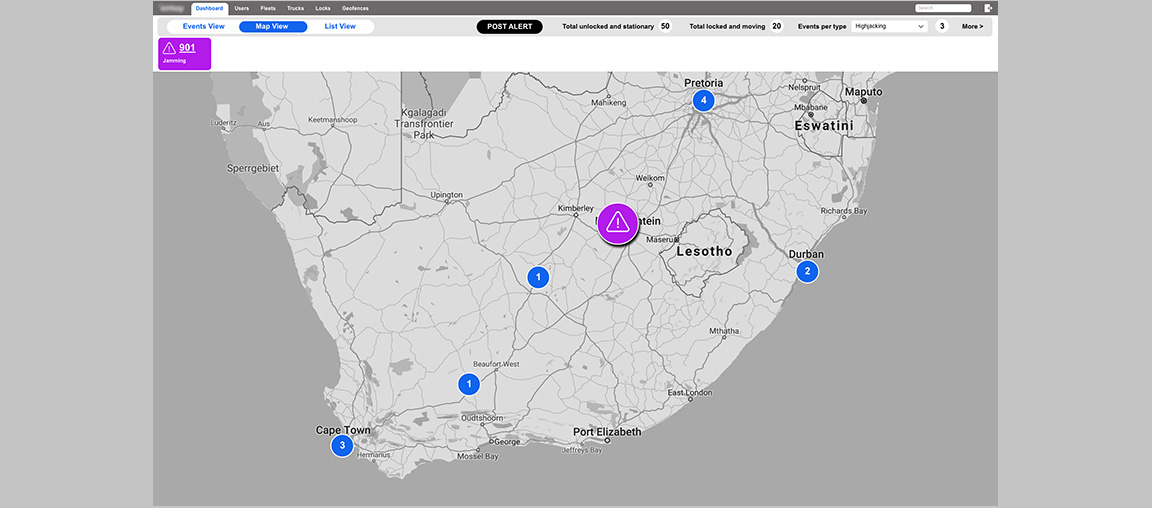 Agents in an operations centre monitor each truck, remotely lock and unlock the doors for drivers at geofence destinations and action prioritised alerts such as highjackings and medical emergencies displayed in the form of tickets.